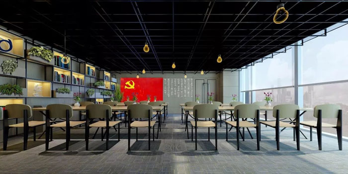 在黨群服務(wù)中心部分,我們充分利用建筑空間層高,增設(shè)二層部分,將黨建工作展示與黨群服務(wù)功能空間既有機融合,又相對獨立,充分考慮了展示參觀與日常使用的便利性。