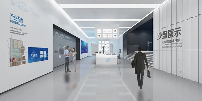 展館設計以招商引資為主要訴求,以“潮涌古雷,能動未來”為主題,以古雷港的自然基礎資源優(yōu)勢為底色,結合古雷港經開區(qū)特色石化產業(yè)元素,深度定制展陳內容,營造獨具地域特色的展廳氛圍,合理利用原有建筑結構進行布局,形成靈動而富有層次的造型組織空間。