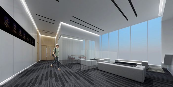 設(shè)計以打造無感體驗數(shù)字化的智能空間為宗旨,把智能、流動、互動、共享的功能結(jié)合其中,設(shè)置《匯智聚能環(huán)》多功能LED藝術(shù)裝置,在滿足使用功能的同時,營造出圓潤、相互交融、充滿活力的氛圍。