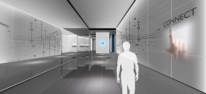展館運用多種科技展示手段,包括多通道投影、智能交互、增強現(xiàn)實、透明屏等現(xiàn)代聲光電技術(shù)。在空間形式上巧妙運用鏡面、抽拉式燈箱、造型產(chǎn)品桌等方式,以簡約的色彩線條,富有層次感的造型,提煉出一個現(xiàn)代化科技企業(yè)應(yīng)有的視覺形象。
