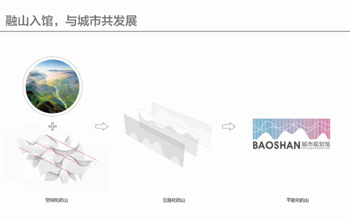 設(shè)計團隊以高科技化、藝術(shù)化、人性化及個性化為設(shè)計要求,提出了凸顯特色、深度策劃、節(jié)能環(huán)保及以人為本的設(shè)計原則及理念。“融山入館,與城市共發(fā)展”成為了本次設(shè)計的創(chuàng)意構(gòu)思。設(shè)計師以山為設(shè)計切入點,通過從不同的視角來看山,演化為展館的整體設(shè)計元素。