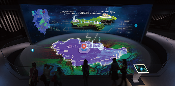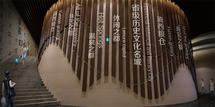 展館整體層高約8米,整體布展通過數(shù)字沙盤、復原模型、數(shù)碼互動、多媒體影音空間、解構(gòu)模型等手段,不僅向觀眾展示了保山悠久的歷史文化,也通過規(guī)劃向觀眾展示了位居滇西極邊之地的保山作為我國南向互利合作戰(zhàn)略的重要交通樞紐的地位。