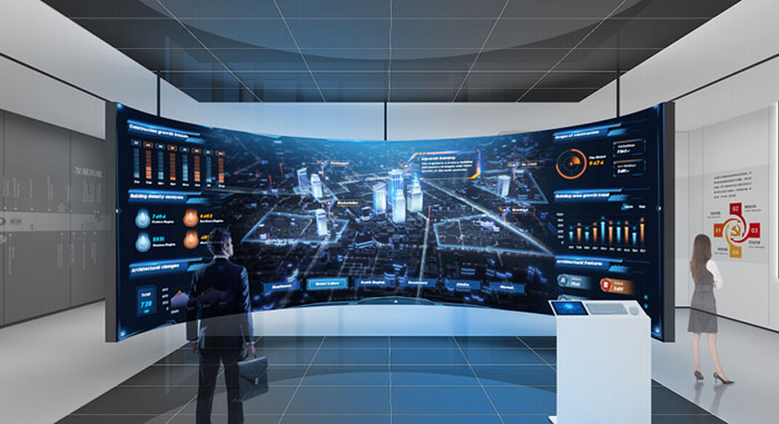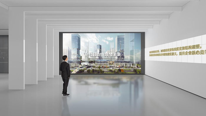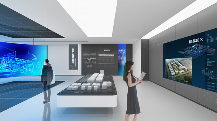 設(shè)計(jì)團(tuán)隊(duì)以現(xiàn)代感、品質(zhì)感、開放感、科技感“四感原則”為空間設(shè)計(jì)理念,營(yíng)造簡(jiǎn)潔大氣的美學(xué)空間。從企業(yè)理念和LOGO中提取視覺元素,打造獨(dú)具特色的展廳氛圍,定制專屬多媒體展項(xiàng),形成美學(xué)與科技融合,靈動(dòng)且多元的造型空間。